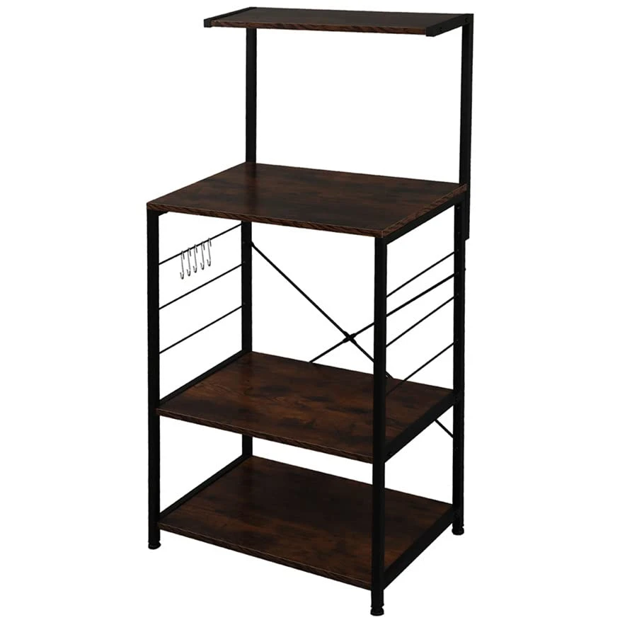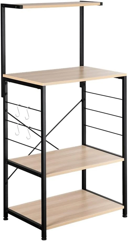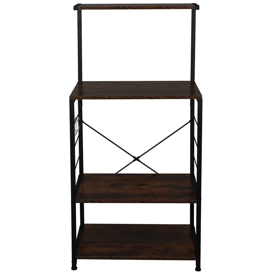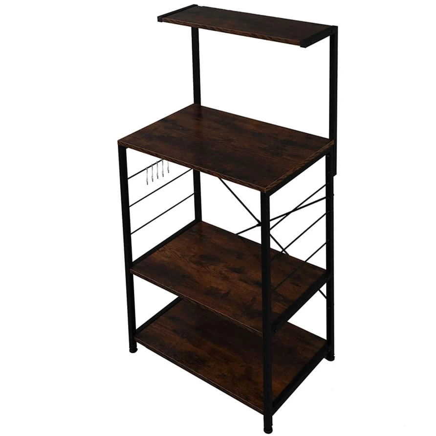 - STURDY CONSTRUCTION – The modern bakers rack is made up of 4-tiered open durable Particleboard and black metal frame. X – shaped brackets for Stability design to prevents shelf from separating vertically and adjust feet to stabilize on level surface, Panel height can also be adjusted.