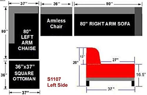 - Set includes: when facing Right Arm Sofa + Left Arm Chaise +Armless Chair + Ottoman + 3 rectangular back pillows and 2 small accent pillows(as seen in the photo).