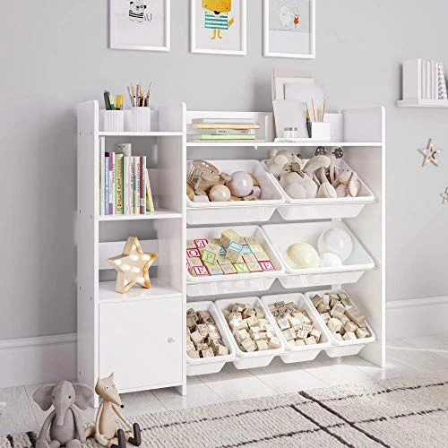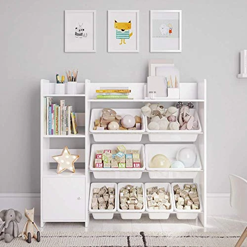 - COMPARTMENTAL & EASY ACCESS: This versatility unit offers a combination of open display bookshelves, closed cupboard and 8 plastic bins to provide ample space for the different types of toys, books, stationary, puzzles and many other surprises that you find on the floor. Unlike cubby toy storage, kids won’t have to rampage through the closed bins to find their toys.