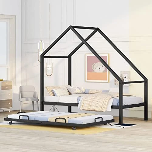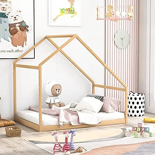 - 【2-in-1 Design House-Shaped Bed Frame】Featuring house-shaped roof, this unique house bed creates a fun and adorable space that not only serves as a cosy sleeping area but also double the purpose as playground.