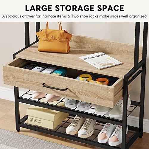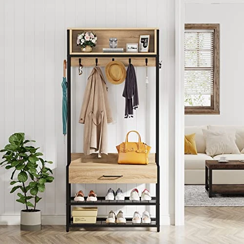- 【3-In-1 Design】This hallstand is a beautiful blend of storage and decor display. It has 3-in-1 multifunctional design, which founded atop a black-finished metal frame, features coat rack, entryway bench, shoes rack and top shelf for more storage organized. It is an excellent addition to any space for keeping the room free of clutter.