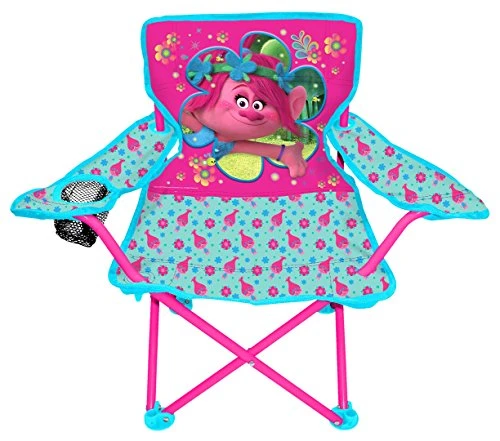 The DreamWorks Trolls fold N’ go chair has bright colorful character graphics and is great for indoors or outdoors. Sturdy metal tubular construction. Folds for easy storage & comes with its own carry bag. Each chair has a safety locking mechanism. No assembly required. Recommended weight limit of 70 lbs. Designed for ages 3+