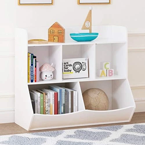 - PLENTY OF STORAGE:This Kid’s Storage Cabinet Features A Bookshelf on The Top for Display Books or Home DÉCor Piece. Three Upper Cubbies and two Large Bins Provide a Place to Stash Books, Toys, Heavy Items, Art Supplies and More.