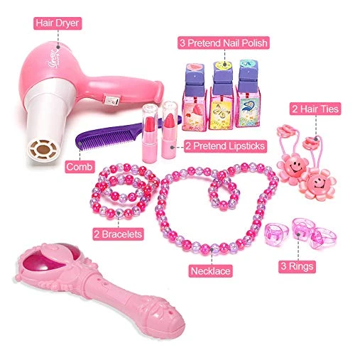 - Makeup Accessories: Except the mirror and stool, this kid vanity set is together with 3 x nail polishes, 3 x rings, 2 x lipsticks, 2 x bracelet, 2 x headband,1 x necklace, 1 x comb, 1 x hair dryer. It make your children enjoy her time with this set.