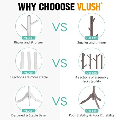 - ★ 【BUY THE COAT RACK WITH CONFIDENCE】Here at Vlush we’re very confident about the premium quality and undeniable durability of our solid wood standing rack. Free replacement of accessories for one year. This means that if there’s something wrong with your new hanging coat rack, we will replace the defective part completely free of charge.