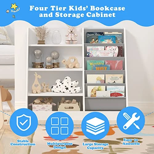- Large and Ample Storage Space: 4 tier wooden book rack and 5 deep storage sling pockets mean that the organization possibilities are endless. The kids bookshelf is large enough to hold books, fluffy animals, balls, toy trucks, art supplies and more… You can keep the toys off the ground and leave enough space for your little one to play and have a fun.