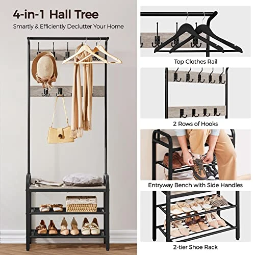 Yaheetech Hall Tree With Bench And Shoe Storage For Entryway, 4-in-1 Coat Rack Shoe Bench With 23 Hooks, A Hanging Rod, Metal Frame, Gray